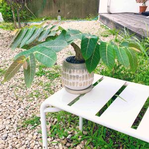 塊根のサイズは、栄養ドリンクの瓶くらいですが、展開する葉はけっこう大きく、幅広。 緑陰が欲しい植物の中央に、少し高めの土台を設けて置いてやるといいかもしれません。 マメ科なので、日が落ちると、葉を閉じるところも、見応えがあって良いです。