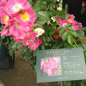 白い恋人パーク ローズガーデンにて 蔦薔薇、ながく延びた枝には沢山の薔薇、見ごたえありました