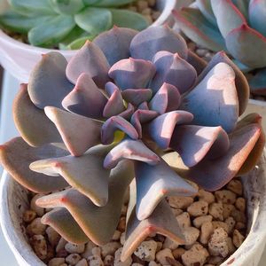 グラプトペタルム丼、その後♫ 寄せてから一ヶ月弱。 それぞれが少し成長して、自然な感じに馴染んてきました♫ 右下に、朧月のカット芽と葉挿しを投入!!🌱 今はおしろいををはたいたような、透き通った色が美しい✧*。◌ 。˚✩😃 丈夫に育った苗らしく、すぐに日向においても全く問題なしでした。 グラプトペタルムだから強いのか⁉ 紅葉も楽しみだな〜٩(๑❛ᴗ❛๑)
