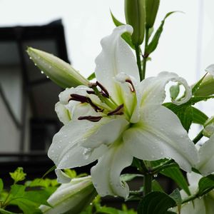 八重咲きカサブランカ ホワイトアイズ。7月4日撮影。青空下も良いですが梅雨🌂空の百合もしっとりとしてお似合い(^^♪です。