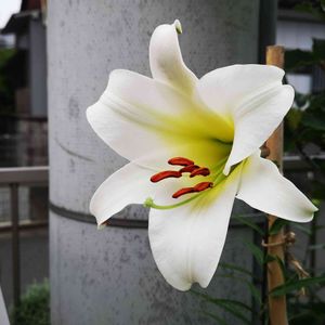 前出の、鉄砲百合・ホワイトトライアンファーターです😊 鉄砲百合の仲間で、大型で中心部の赤い有名品種「トライアンファーター」の、純白種です(*^^*) 鉄砲百合に他の百合の血が入ることで、大柄で丈夫な品種になったそうです。香りは鉄砲百合の香りですねー💕