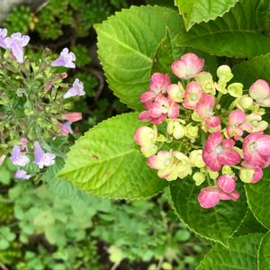 ピンク花のカラミンサとアジサイ 数年前にお迎えした、こちらのアジサイは、確か マジカルのグリーンファイヤーだったはず💦どうしたのかな?記憶違いかな? 経験談、有りませんか?