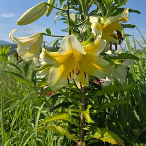 OTユリ コンカドール イエローカサブランカとして流通しているユリが開花しました😍😍 花が非常に大きくて豪華です!イエローカサブランカと呼ばれていますが、オリエンタルユリ(ヤマユリやカノコユリ、ササユリ等)を交配したものであるカサブランカとは違ってオリエンタルユリにトランペットリリー(リーガルリリー等)を交配したOTユリ(オリエンタル×トランペット)なので花以外はカサブランカとはやや異なるので要注意です! とはいえ、トランペットリリーの遺伝子が入ったことで黄色等の品種が生まれるようになったことは間違いないので凄い革命的ですね😍😍
