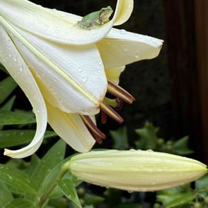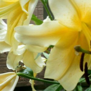 今朝 開きがけの百合に お客さん発見(☆∀☆)🐸 その後気になり90分後には 🐸🐸(*´艸`)フフフッ♡ 見え難いですが蕾の🌿見て下さい
