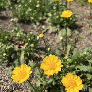 【1枚目】やっとこクリサンセマム・ムルチコーレ・アップライトクリームが咲いてきました😆 曇りだと花が開かないのでなかなか撮影できていませんでした。種まきから203日目/6ヶ月と21日目。 【2枚目】こちらは3株植えの鉢。あまり暴れないんですね。大人しく咲きそうです。 【3枚目】咲き始めは右下のようなイエローですが、咲ききると中央のように色が薄くなります。色味はクリームイエローかな。ムルチコーレでよく見るイエローより優しい色合いで、何にでも合いそう👍 【4枚目】こちらはクリサンセマム・パルドサム・スノーランドとの比較。わりと小さめな花径ですね。この2種のクリサンセマム、せっかくお花の雰囲気や花期は合うのに、いかんせん株姿が全然違うので混植は難しいかもしれません😣 ジグザグ植えで前列をムルチコーレにすれば何とか見れるかな? 来季は試してみようかな🤔 【5枚目】こちらは地植えにしたクリサンセマム・パルドサム・スノーランド。やはりスノーランドはノースポールに比べると草丈が低くお行儀かいいです🤭