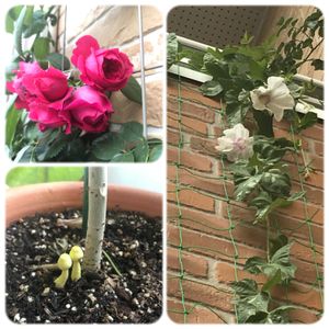 台風無事に通り過ぎて行きましたが急などしゃ降りが何度もきて不安定ですネ。 右上から時計回りに。 ナエマとルブスをチョンパしてみました、ルブスは根が出れば寄せ植えに入れたいな。 ディスキディアインブリカータは先週お連れしました、花が咲いています、葉っぱはクルンクルンしてますが元気! 台風を乗り越えて揃い咲のグラハムトーマスが可愛い💕