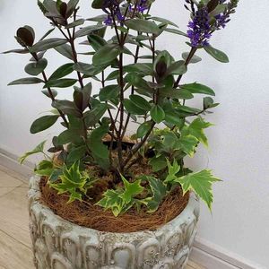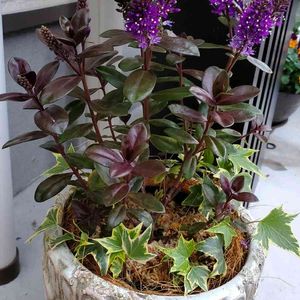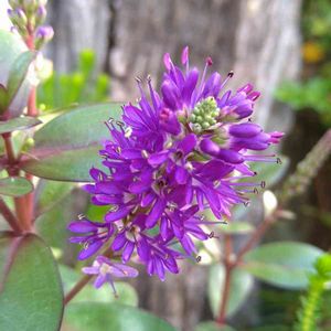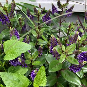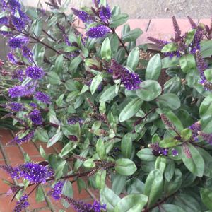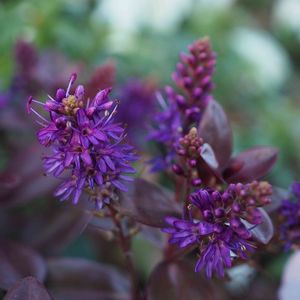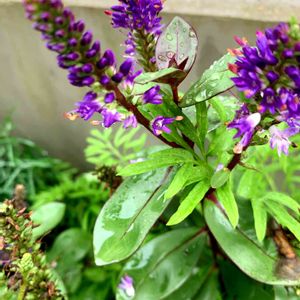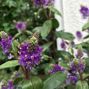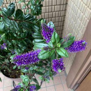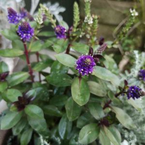 紫色の可憐な花がたくさん集まって円錐形に咲いています。 ベロニカグレースの花は、光沢のある濃緑色の葉っぱとのコントラストも美しい。 冬になると葉っぱがチョコ色に変色しカラーリーフとしても楽しめます。 ニュージーランド原産。 ゴマノハグサ科常緑多年草。 ※この花の名前中々分からず、教えて!で皆さまから教えて頂きようやく分かりました。有難うございました!