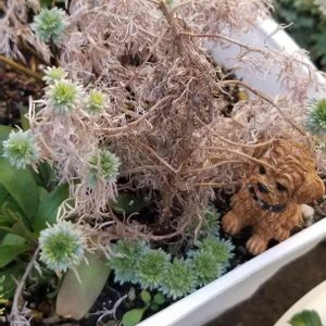 (*∩ω∩)モーイーカイ🐶 わんちゃんがかくれんぼ 冬の朝霧草は、クルクルわんちゃんの毛みたいになって あぁ、枯れちゃった❓ まだ、先端が残ってる大丈夫かも❓ そのままにして置いたら、根元に新芽が6つ並んで顔を出してました🤗 これから あのなでなでしたくなるシルバーグリーンのもふもふになっていくのね😊💕