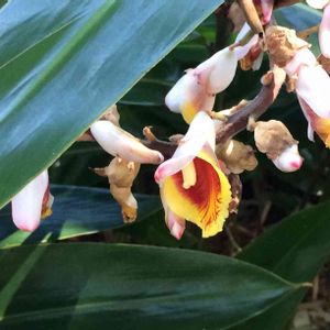 月桃(ゲットウ) の葉と、お花(奥の方に見える?)です❣️ 数年前より石垣島で入手した種から、生長して🌱 今や7株くらいを🏝地植えや鉢で育てている 大切な❣️ 和のスーパー🌿パワー✨ハーブ🌿 ティーやコスメにと、利用価値も幅広くて大活躍です🥰 こちらは、以前に植物園の温室で見た写真です📸 スゴイ巨大ですよねー♪ 関東では、なかなか開花しないと言われていますが、 今年の夏こそ❗️ウチの株から、どうか開花して欲しい🙏 そんな願いを込めて🙌