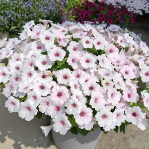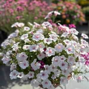 PWスーパーチュニア ビスタ シルバーベリー たくさん咲いてきました🌸 花弁の中のピンク色がワンポイントで可愛いです💕