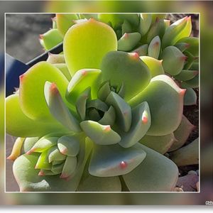 ピンク💗の縁どりが可愛らしい… ポーチュラカリアとキルヒネアの子供etc 寒くて外にも出れないので… 初めて多肉ちゃんの寄せ植えを 楽しんでみました*↟⍋*↟ 明るいグリーンが瑞々しい…🍀*゜