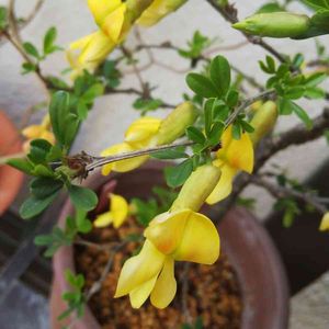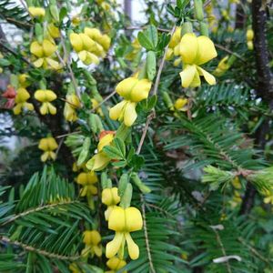 ムレスズメ。中国名は金雀花。 花言葉は自由な生き方。群れている枝にとまっているスズメが、やがて自由に飛び立って行くことを連想させるからであろうと・・。