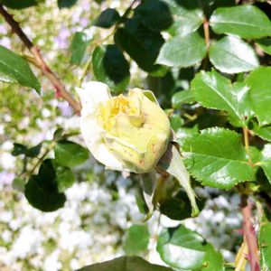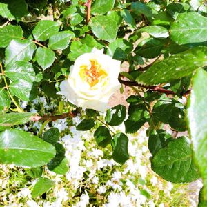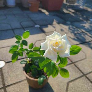 「ビブラマリエ」 真っ白な薔薇のビブラマリエが咲きました🎶 親苗がいまいち元気が無くて、これは挿し木で育てた苗になります。 ビブラマリエの挿し木ばかりが成功して、他の挿木がイマイチです。😅 ゴールデンハート・ミスターリンカーンの挿木がイマイチです。