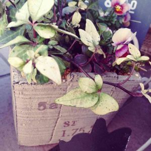 こんばんは( ´ ▽ ` )ノ 可愛い陶器鉢を庭で見つけたので植え替えました グリーンとオフホワイトの配色でアンティークっぽい( ´ ▽ ` )♡ 出来は置いといて、やったことに意味があるよね!← じーちゃん可愛い陶器残してってくれてありがとう(´・Д・)」