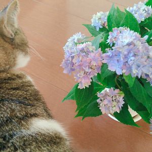 今年はアジサイはお迎えしないと思ってたのに、 もうお迎えしてしまいました。 先週木曜にお店で見て、ひとめぼれ。 よく考えよう、って思ったけど、頭から離れず もしまだいてくれたらお迎えしようとお店に向かいました。 待っててくれて、ありがとね💙 ニャンコは、ちらりと見て素通り。