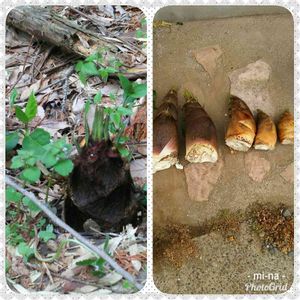 隣りのおばちゃんが、 (もうたこの子てでるよ)って教えてくれた。 裏山行ったら、たくさん出てたよ。 家は主人が、竹の子食べるとお腹をこわすので、食卓へはあがりません。どんだけ虚弱体質なんだ😒 なので、いつも誰かにあげてます😅
