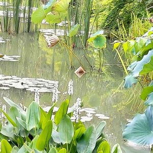 ミズアオイ科 ポンテデリア属 南北アメリカ 原産 淡水の湿原~沼地に自生 本種を含め5種確認されている 水生植物 ホテイアオイの ように浮遊せず 地下茎にて 繁殖する 水のある風景 ポンテデリアの白花種 和名 ナガバミズアオイ 寒さには比較的強いようで 一見 枯れたように見えても 時期になれば 葉が萌出してくる そうです。 この日も暑かったですが 涼しそうに咲いていました。