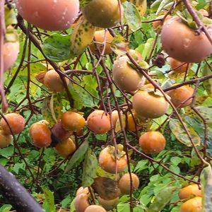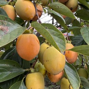 こんにちは☔️ 午後から☔️がふりだしました。 我が家の柿です。🟠🟠🟠🟠🟠 去年に比べて実が凄い事になっています。 低く剪定したので収穫しやすくなりました。でも重たくて枝がしなってます。 もう少しで収穫出来そうです。🤗🧡 1、2個試食することに。?