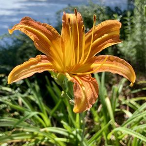 瀬戸内海の海辺に沿った県道の林縁に咲いています 昨年ハマユウを見つけた場所です これはハマカンゾウでしょうか お初にお目にかかります! ハマカンゾウは ワスレグサ科ワスレグサ属の多年草で 在来種! 関東地方以西の海岸近くの岩場や草地に生え 橙赤色の花を咲かせます! ノカンゾウとの違いは 葉が冬でも枯れないという点のみらしく その点は確認できていませんが 生育環境からはハマカンゾウの可能性が高いと思われます 5自治体で絶滅危惧Ⅱ類あるいは準絶滅危惧種です 花被片は6個 橙色から橙赤色 中央は色が薄い 開花は7-9月 色鮮やかな花と 空と海の青さはよくマッチします!