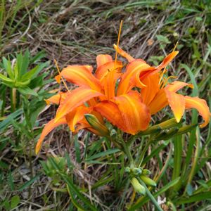 ハマカンゾウ ワスレグサ科ワスレグサ属 多年草 関東地方以西の太平洋岸、四国、九州に分布 海岸に生えるので、ハマカンゾウとなる。 花期7〜10月 ノカンゾウによく似ているが、開花期が遅い。 草丈70〜90cm 葉は長さ60〜70cm、 幅1〜1.5cmで濃緑色で厚くて光沢がある。 葉は冬場も枯れず、常緑である。 花は橙黄色で、6弁花の一重の花を花茎の先に3〜6個付ける。 朝咲いて夕方しぼむ一日花である。