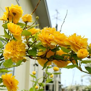 黄金色に近い黄色の花が咲く 🌼ヤマブキ(山吹) 〜5/15今日のお花〜 別名はヤマブリ。 花言葉は、「気品」「崇高」です。 2023/5/4🌥️ 高さのある枝だったので見上げての撮影になりました。