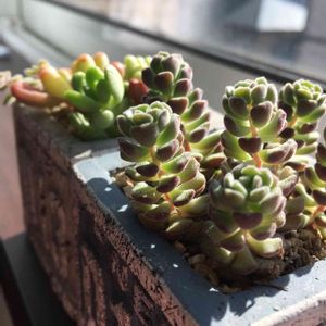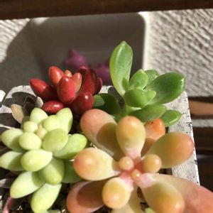 本当は玄関に飾りたいけど、ウッドデッキの上で頑張ってもらっています🌿 メルカリ多肉ちゃん達❤ 寒暖の差が激しいし、陽当りが良いせいか、色づきもいい感じ。 玄関置きたいなー😄 (でも陽当り悪い。。。)
