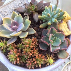 ちょっと見ないうちに、可愛く色付いて ました➰🎶🎵🎶♐️ 左から、ベビーサンローズ 、ダリーダル 大葉丸葉万年草〰〰 ミントベアー君も、嬉しそう💚