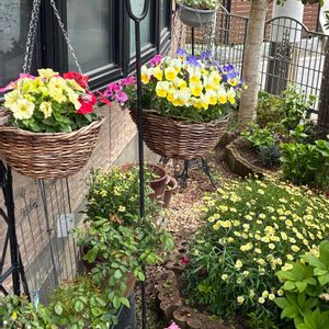 イエローレモンのペチャニア その下にマーガレットやウィンターコスモスがモリモリと広がって来ました🩷❤️
