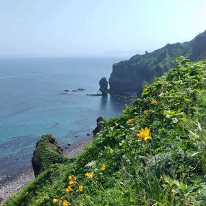 神威岬 女人禁制の門から約770m 両側に日本海の雄大な眺めが広がる遊歩道「チャレンカの小道」 義経がここまで逃れたというここは異国のようでした🍀💚💙🌊🫧 エゾカンゾウ🧡 ハマナス🩷