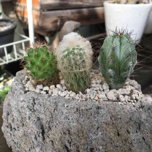 100均サボテンを軽石の鉢に寄せ植え🌵 真ん中は大好きなフワフワ白毛サボテン😚 やっと100均で出会えた❗️ 老楽かな?