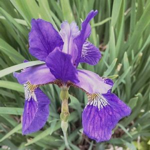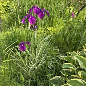この花が咲くと毎年悩む! 名札を付け忘れているから悩む! 花菖蒲かな?カキツバタかな? 草取りに夢中に成り、先に咲いた1輪を、見てやれなかったです! 残り4輪を🤳パシャ花色も好きですが斑入り葉が涼しげで好きです😊 ネット検索で、『花びらの根元が黄色い線なら花菖蒲(ハナショウブ)、白い線なら杜若(カキツバタ)です。』と教えて頂きました。 大きな🏷️を付けなくてはですね。