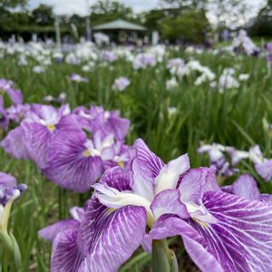 明治神宮御苑の中の菖蒲田💜🤍🩷 お天気に恵まれ🌞人出多数🚶🚶🚶 美しいけど…陽が照りつけ暑さで萎みそうでした🫠 5枚目は北門前に飾られていた「大江戸」という品種