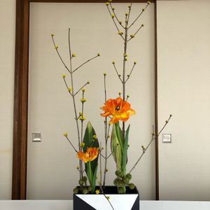 2020.02.08 レッスン2回目✌🏻(˙꒳˙)✌🏻 最初はみーんなつぼみやったのに、活けてる間に花が咲いてきた(゚o゚)! サンシュウ?サンシュユ? とっても可愛らしくて癒される〜( ˘ω˘ )◎