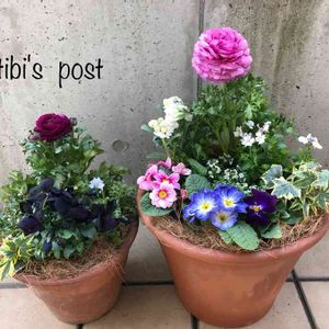 ラナンキュラスの 寄せ植えできた✨ 右は義母へのプレゼ ント♫ 左は自宅用。 右は春っぽく可愛い 色味で。左はシックな 感じにしました。 まぁ、自宅用は残った 苗で急遽植えたただけ ですけど(−_−;) 皆さんはどちらが お好みですか?