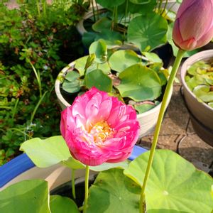 茶碗蓮と書いて売ってた蓮が咲きました☺️ 昨年は、植え替えさぼり咲いてくれなかったので💦 ほそーい蓮根でしたが咲いてくれました🎵