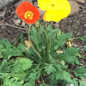 ポピー。黄色とオレンジ😃 1ポットだから一株と思ってたけど小さいのふた株あったのかな? それとも一株から2色咲くものなのかな?😊