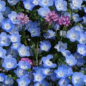 こんばんは。 先日、配達で通ったところに 毎年この時期、ネモフィラ畑が出現します。 地名の「青」にかけて 青いじゅうたんを作っているのです。 写真を撮ろうと近寄ってみたら ネモフィラの間に混じって ちょこんと、れんげが咲いていました。 かわいいですね。