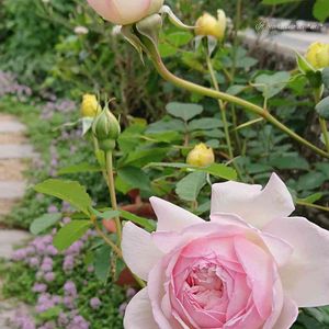 セシルドゥヴォーランジェとシュクレが並んで咲いています! セシルドゥヴォーランジェは花によって色味が全然違う☺️薄ピンクもあったり濃いピンクが入っていたり。 シュクレは黄色っぽい!
