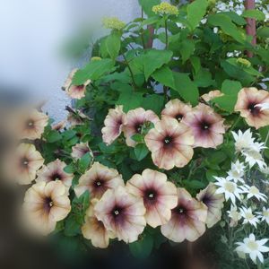八重咲きペチュニア ホイップマカロン ショコラブラン* やっとポツポツ咲いてきました。今お花は3つです🌸 中心がショコラ色であとはオフホワイトです♡ そして一番外側の花弁がうっすらとピンクがかっています💕 ここ最近色んなお花が咲き始めてくれて嬉しい🫶🥰