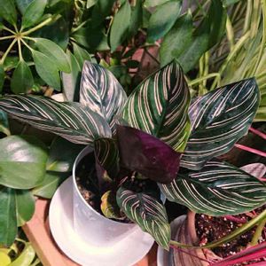 夜に撮影したカラテア類は、葉っぱの裏側の紫も映えます。。 左のカラテア オルナータ サンデリアーナは最近のお気に入りです🍀 お気に入りのカラテアは絶やさないようにしないと。。 さて真ん中の斑入りは最近買ったのですが、どなたか名前ご存知ですか?