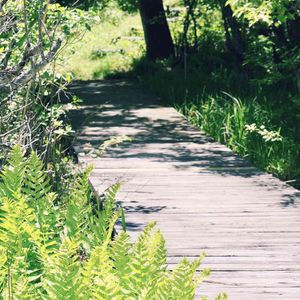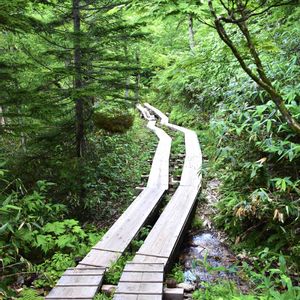 大町市の唐花見湿原。 植物が高く茂る木道でした。