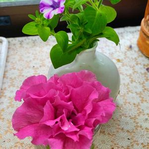 摘芯したお花がキレイで捨てられない!しばらく飾っておきます。手前は種から育てたペチュニアF1ダブルカスケード。タキイさんから購入。カタログに「巨大輪八重咲き」とあるように、本当に大きなお花です。計ると直径9センチ。いま、苗で20ポット育ててます。