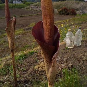 珍しい花発見!!蒟蒻の花✨ 調べてみたら蒟蒻の花が咲くのは4年芋以上作付けされた物でないと花が咲かないので産地でも蒟蒻の花を見る事は珍しい。 「蒟蒻芋、こんにゃく玉(直径15~20cm)」ですが、「おでん」などでおなじみの蒟蒻の原料として蒟蒻芋が栽培されています、 蒟蒻芋は1年芋、2年芋、3年芋とあり産地では3年間栽培し、3年芋を出荷し洗浄後、薄くスライスし乾燥させ製粉し 蒟蒻粉として流通します、蒟蒻工場では蒟蒻粉を練り石灰の粉を混ぜた熱湯で煮て蒟蒻製品となります。 栽培畑では3年で出荷されてしまうので花は見れない、路地などの長年生えているのに花を着ける。 「蒟蒻の花」は、5月の中旬~6月上旬に紫がかった海老茶色の変わった形の花が咲きます。 丈が約1メートル30センチになり大型の花を着け花が終わってから葉が地下部より出て来る。