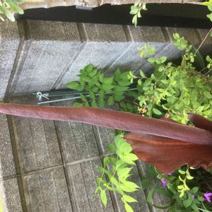 コンニャクの花 友達から送ってきました。 15年前くらいに貰ってきて初めて花が咲いたそうです。 珍しい花なので見てくださいと。 検索するとおよそ5年に一度しか咲かない珍しい花らしいです。 紫がかった海老茶色の変わった形の花。 高さは1.5mくらいありそうです。 畑では3年で出荷されてしまうので、花を目にする機会はあまりありません。 花期:5〜6月 原産地: インドシナ半島 英語圏では「Devil’s Tonque」(悪魔の舌)と呼ばれています。😱 開花すると腐ったような強烈な匂いがすることが知られています。😫 「世界で最も醜い花」「世界一大きな花序」「死体花」と評される「ショクダイオオコンニャク」は特に世界的に開花例が少ないそうです。