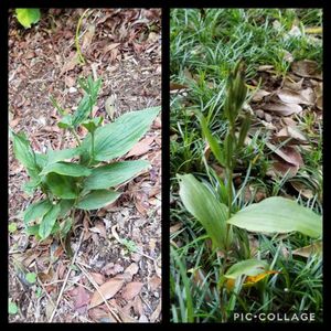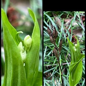 先程載せたのは、金蘭ですが、こちらは、銀蘭(ギンラン)だと思います💚 右の写真の枯れ木は、昨年 銀蘭が咲いたものなので、隣に出てきたこの蕾を付けたお花は銀蘭では無いかと思われます。引き続き、開花を待ちます♡♡