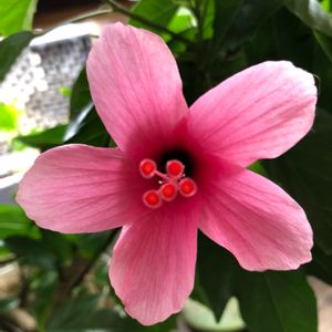 今日咲いた🌺ハイビスカス🧡オレンジフラミンゴ 変です! 親株枯れて〜挿し木の3年目クン、三段花だったのに 今年は??🤔 色といい貧相で〜🤣 たまにしか咲かないし〜