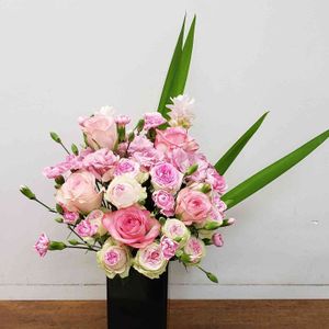お久しぶり投稿です。 今日は梅雨特有の蒸し暑さでした😥 夕方からパラパラ☔ 少しだけ、気温が下がったみたいです。 毎月のフラワーアレンジメントレッスンに行ってきました。 仕上げたばかりの作品です😌 自分で自由に形を決めてお花を固めて活けてみよう!という課題 好きなバラ🌹だったので、活けるの楽しかったです🎵
