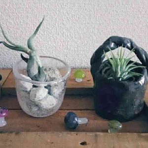 普段は、ベランダの遮光ネット越しの定位置にいるイオナンタとカプトメデューサ🌱 気が向いたので、アジアン雑貨に乗せて📷 サイズ的にも気持ち良し😊