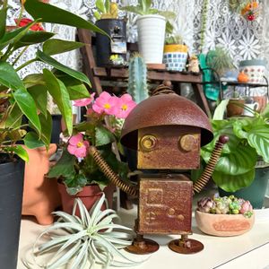 ブリキのロボット仲間入り😊 雑貨店に色々なブリキロボットが並んでて 久しぶりに聞こえた👂 「連れて帰って〜🧡」って😆 玄関先に置くつもりなんだけど、 しばらく出窓にいてもらおう😉