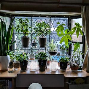 出窓のカーテンを洗たくして…模様替え✨ babyワキワキ…シェフレア元気✨ リトルワーティーさんも元気だ! 4鉢にも増えたディフェンバキアさんも超元気✨